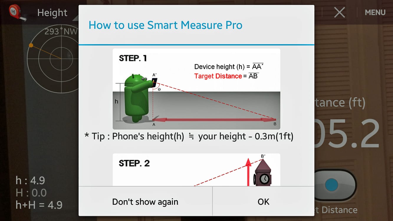 Unless you kill it, it even begins with a graphic reminder of how to do the sight (above). It can measure how high you or an object is (if you know the distance), the distance and bearing (if you know heights) or –Gasp!— even areas. It has an on-screen bubble level to improve your accuracy.