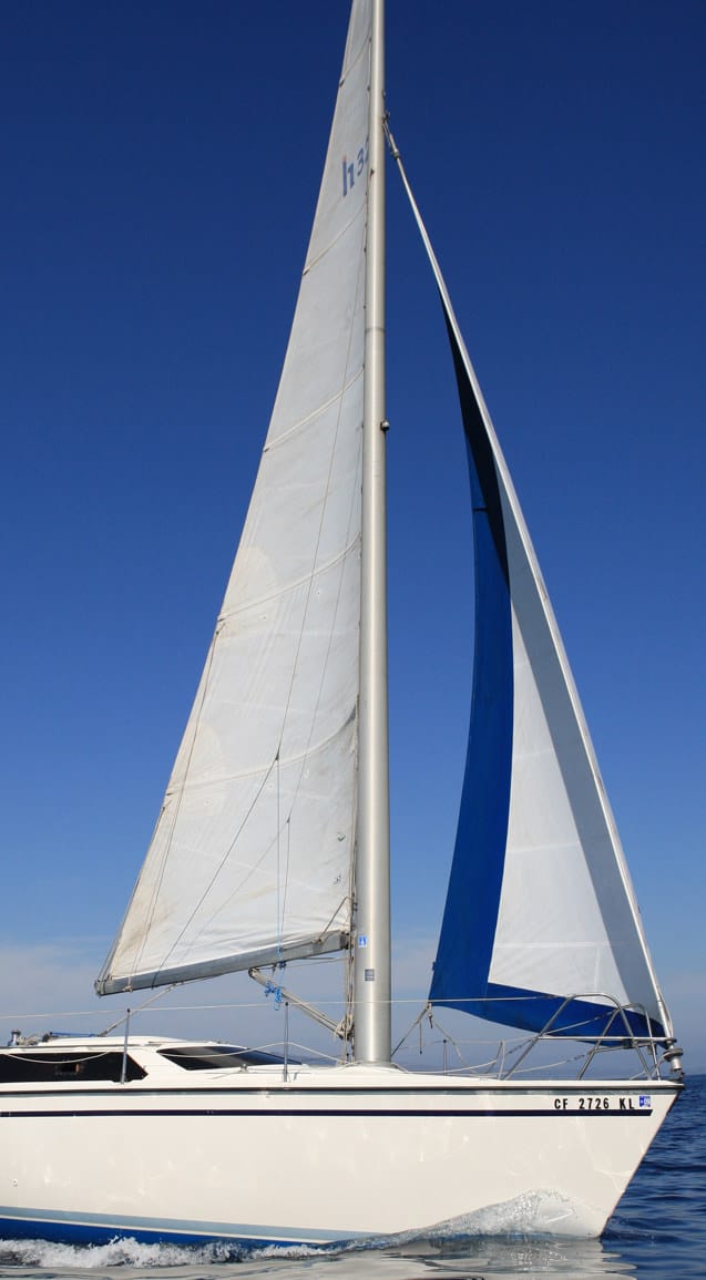 On the Hunter Vision, there is what looks like a street lamp pole holding an enormous mainsail in a quasi cat rigged set up. Not surprisingly, the configuration gets a hearty dose of contradicting reviews. Some believe that the weight and width of the freestanding mast make for poor sailing qualities, particularly upwind. Although most critics will concede that the boat does pretty well on a reach and downwind (due to the huge main’s ability to be set farther out than most boats can achieve) they will cite other qualities that indicate the boat is something of a dog. Many don’t like that there is nothing to hold onto when going forward and others flinch at the manageability (or lack thereof) of such a large main.