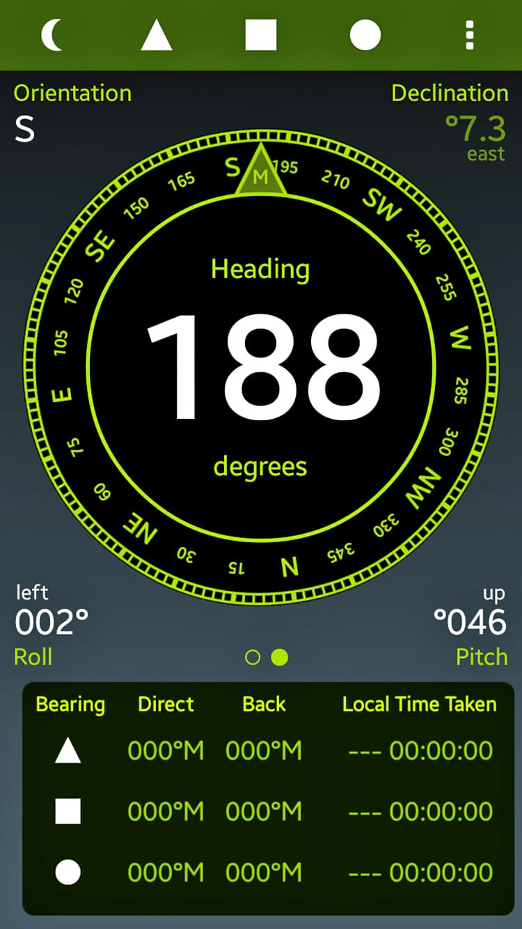 The first screen shows a dynamic compass heading (following the long side of the phone) plus the general cardinal direction, local variation (which is marked “Declination” because they are British, doncha’ know), and handy pitch & roll indicators to remind you to hold your device flat for accuracy, as every good fluxgate compass requires. The little crescent moon at the top puts the display instantly into night-vision mode.