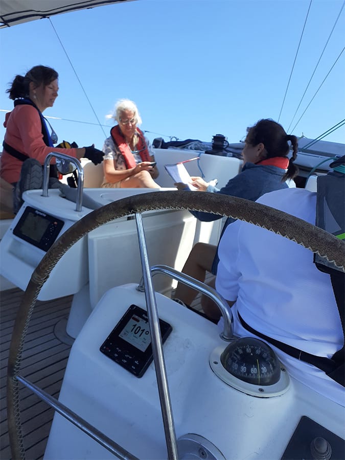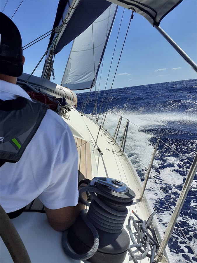 The crew quickly settled into rhythm, steering confidently and trimming sails as needed. Jonathan, our captain, rotated helm duties among the crew, assessing their skills. All proved competent, and with bigger seas ahead, it was clear they would get they chance to improve rapidly.