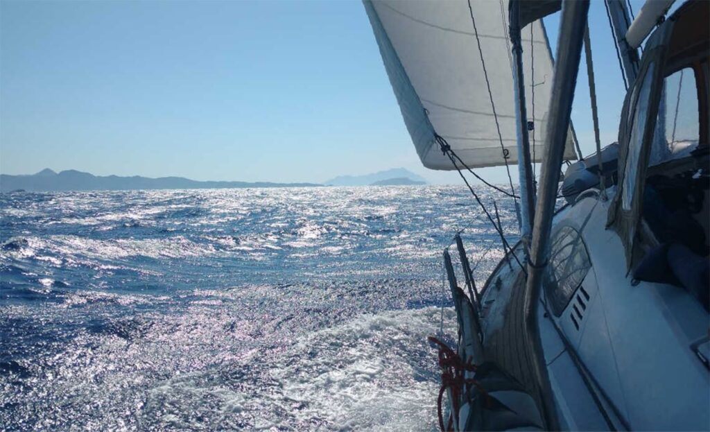 By 10:30 a.m. we were under sail, heading toward the island of St. George, roughly the halfway point between the Saronic Gulf and the Cyclades. Conditions were favorable: a steady 15 knots on the beam, giving us easy reaching conditions. Forecasts, however, warned of stiffer breezes ahead – 20–25 knots with seas of 2–3 meters once we entered the Cyclades. Fortunately, the wind would be mostly on the beam or slightly abaft, making for fast and manageable sailing.