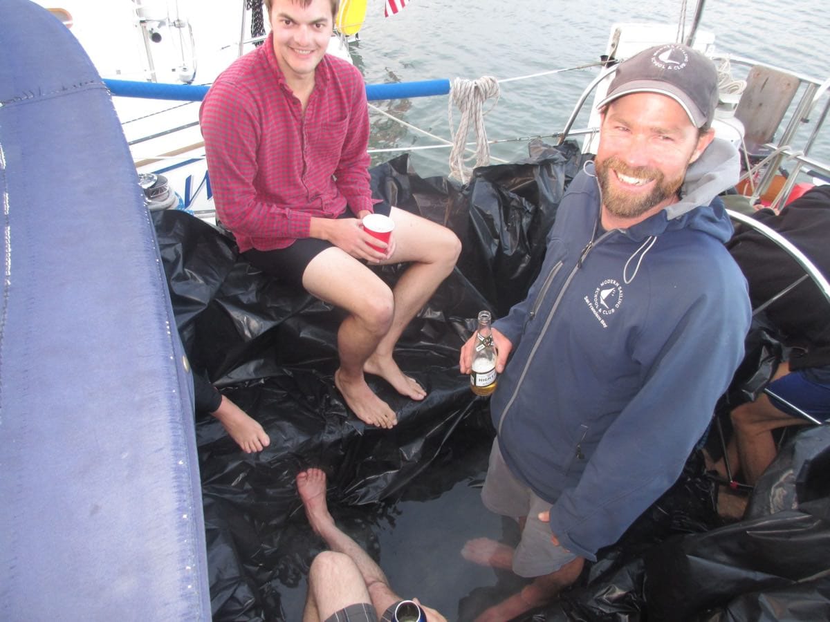 We broke out the grill, burgers, and beer and the sailabration began. Several boats joined us and before we knew it, the raft up had grown to a crew of more than 10 people. There had been promises of good times and “yacht tubs” and I wasn’t disappointed. As the sun began to set, hosts Travis and Mel threw down a giant, heavy duty, black tarp in the cockpit of their boat, turned on the hot water heater strapped to the stern pulpit and steaming water (salt water – don’t be silly, we’re in a drought you know!) started to pool in bottom of the cockpit. It’s not exactly a sailor’s first instinct to pump water into the boat, but let me tell you, it was glorious! As other boats joined us, our yacht tub grew in size and Mel was sure to set the mood with glow sticks galore.